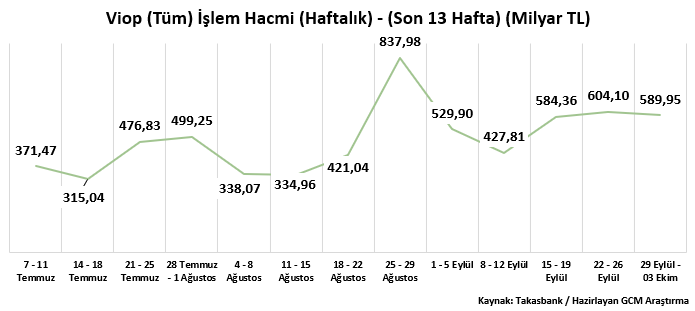 29 Eylül – 03 Ekim 2025 haftasına yönelik VİOP toplam işlem hacmi 584,36 milyar TL olarak kaydedilmiştir. Bu tutar bir önceki haftaki 604,10 milyar TL ile kıyaslandığında hacimsel açıdan kısmi bir düşüş izlenmektedir. Son 13 haftanın en yüksek hacimsel performansı 25 – 29 Ağustos haftasındaki 837,98 milyar TL, en düşük hacimsel performans ise 14 – 18 Temmuz haftasındaki 315,04 milyar TL olmayı sürdürmektedir.
