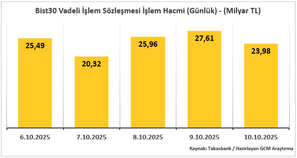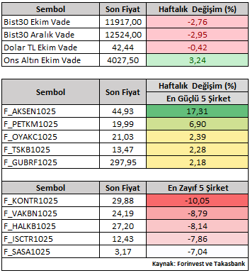 06 - 10 Ekim 2025 haftasına yönelik değişimlere (%) geçtiğimizde; Bist30 Ekim vade sözleşme fiyatı haftayı yüzde 2,76 düşüşle 11.917 seviyesinden kapattı. Viop tarafında işlem gören şirketlerin haftalık performansını (Eylül vade) değerlendirdiğimizde, pozitif tarafta dikkat çeken şirketler AKSEN ve PETKM olurken, negatif tarafta dikkat çekenlerse KONTR ve VAKBN olarak kaydedilmiştir.