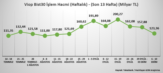 431,75 milyar TL toplam hacmin 123,36 milyar TL’si ise endeks olarak kaydedilmiştir. Geçtiğimiz hafta bu oran 157,88 milyar TL idi. Son 13 haftanın en yüksek hacimsel performansı 15 – 19 Eylül haftasındaki 200,27 milyar TL, en düşük hacimsel performans ise 14 – 18 Temmuz haftasındaki 111,35 milyar TL olmayı sürdürmektedir.