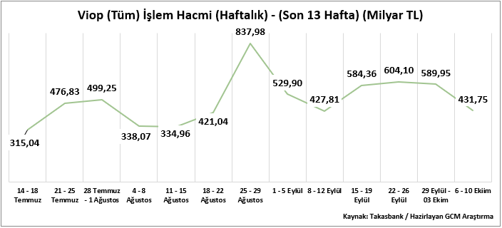06 – 10 Ekim 2025 haftasına yönelik VİOP toplam işlem hacmi 431,75 milyar TL olarak kaydedilmiştir. Bu tutar bir önceki haftaki 584,36 milyar TL ile kıyaslandığında hacimsel açıdan önemli bir düşüş izlenmektedir. Son 13 haftanın en yüksek hacimsel performansı 25 – 29 Ağustos haftasındaki 837,98 milyar TL, en düşük hacimsel performans ise 14 – 18 Temmuz haftasındaki 315,04 milyar TL olmayı sürdürmektedir.