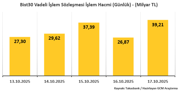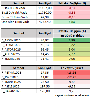 13 - 17 Ekim 2025 haftasına yönelik değişimlere (%) geçtiğimizde; Bist30 Ekim vade sözleşme fiyatı haftayı yüzde 3,54 düşüşle 11.167 seviyesinden kapattı. Viop tarafında işlem gören şirketlerin haftalık performansını (Ekim vade) değerlendirdiğimizde, pozitif tarafta dikkat çeken şirketler AKSEN ve SOKM olurken, negatif tarafta dikkat çekenlerse PETKM ve TSKB olarak kaydedilmiştir.