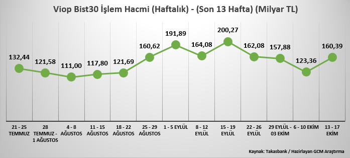 491,94 milyar TL toplam hacmin 160,39 milyar TL’si ise endeks olarak kaydedilmiştir. Geçtiğimiz hafta bu oran 123,36 milyar TL idi. Son 13 haftanın en yüksek hacimsel performansı 15 – 19 Eylül haftasındaki 200,27 milyar TL, en düşük hacimsel performans ise 4 – 8 Ağustos haftasındaki 111,00 milyar TL olmayı sürdürmektedir.