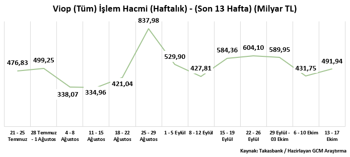 13 – 17 Ekim 2025 haftasına yönelik VİOP toplam işlem hacmi 491,94 milyar TL olarak kaydedilmiştir. Bu tutar bir önceki haftaki 431,75 milyar TL ile kıyaslandığında hacimsel açıdan önemli bir yükseliş izlenmektedir. Son 13 haftanın en yüksek hacimsel performansı 25 – 29 Ağustos haftasındaki 837,98 milyar TL, en düşük hacimsel performans ise 4 – 8 Ağustos haftasındaki 338,07 milyar TL olmayı sürdürmektedir.