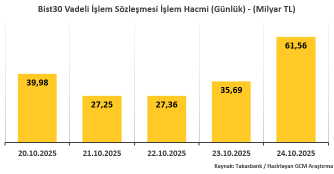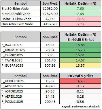 20 - 24 Ekim 2025 haftasına yönelik değişimlere (%) geçtiğimizde; Bist30 Ekim vade sözleşme fiyatı haftayı yüzde 7,60 yükselişle 12.032 seviyesinden kapattı. Viop tarafında işlem gören şirketlerin haftalık performansını (Ekim vade) değerlendirdiğimizde, pozitif tarafta dikkat çeken şirketler ISCTR ve KRDMD olurken, negatif tarafta dikkat çekenlerse DOHOL ve AKSEN olarak kaydedilmiştir.
