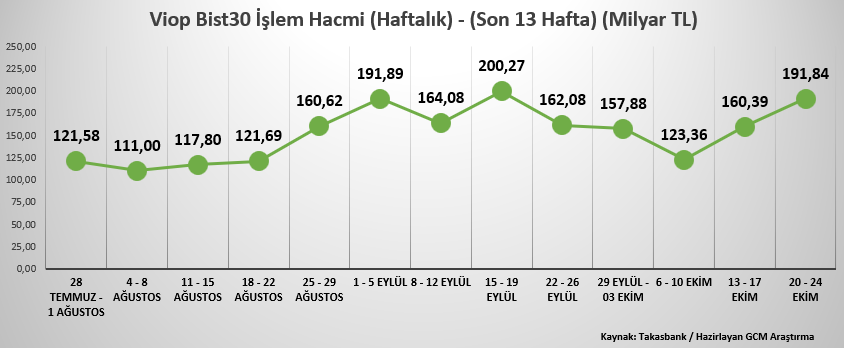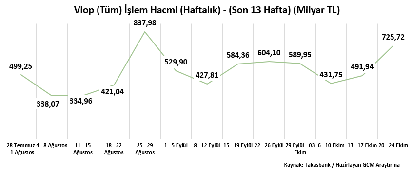 20 – 24 Ekim 2025 haftasına yönelik VİOP toplam işlem hacmi 725,72 milyar TL olarak kaydedilmiştir. Bu tutar bir önceki haftaki 491,94 milyar TL ile kıyaslandığında hacimsel açıdan ciddi bir yükseliş izlenmektedir. Son 13 haftanın en yüksek hacimsel performansı 25 – 29 Ağustos haftasındaki 837,98 milyar TL, en düşük hacimsel performans ise 11 - 15 Ağustos haftasındaki 334,96 milyar TL olmayı sürdürmektedir.