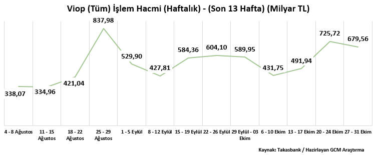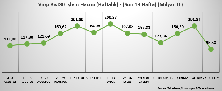 27 – 31 Ekim 2025 haftasına yönelik VİOP toplam işlem hacmi 679,56 milyar TL olarak kaydedilmiştir. Bu tutar bir önceki haftaki 725,72 milyar TL ile kıyaslandığında hacimsel açıdan düşüşe işaret etmektedir. Ancak 29 Ekim Cumhuriyet Bayramı sebebiyle salı günü yarım gün, çarşamba günü tam gün yurt içi piyasaların kapalı olması, hacimsel olarak bir önceki haftaya kıyasla izlenen düşüşü normalleştirmektedir. Son 13 haftanın en yüksek hacimsel performansı 25 – 29 Ağustos haftasındaki 837,98 milyar TL, en düşük hacimsel performans ise 11 - 15 Ağustos haftasındaki 334,96 milyar TL olmayı sürdürmektedir.