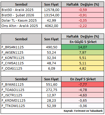 27 - 31 Ekim 2025 haftasına yönelik değişimlere (%) geçtiğimizde; Bist30 Aralık vade sözleşme fiyatı haftayı yüzde 0,59 düşüşle 12.578 seviyesinden kapattı. Viop tarafında işlem gören şirketlerin haftalık performansını (Kasım vade) değerlendirdiğimizde, pozitif tarafta dikkat çeken şirketler AKSEN ve BSAN olurken, negatif tarafta dikkat çekenlerse BIMAS ve TOASO olarak kaydedilmiştir.