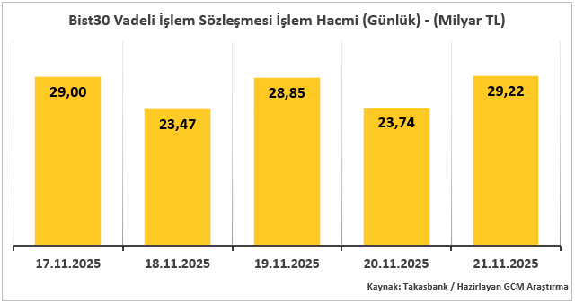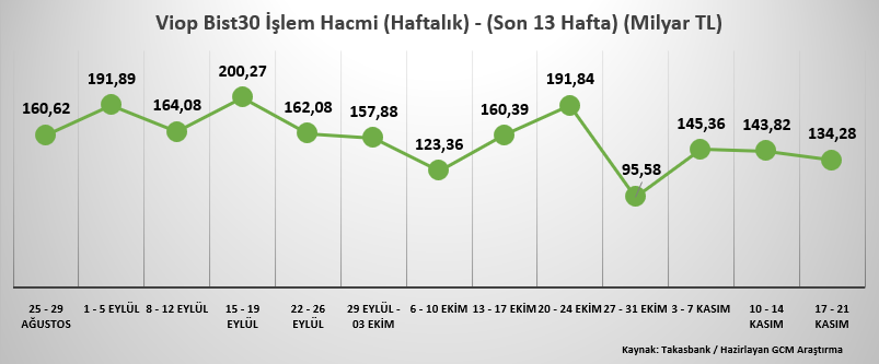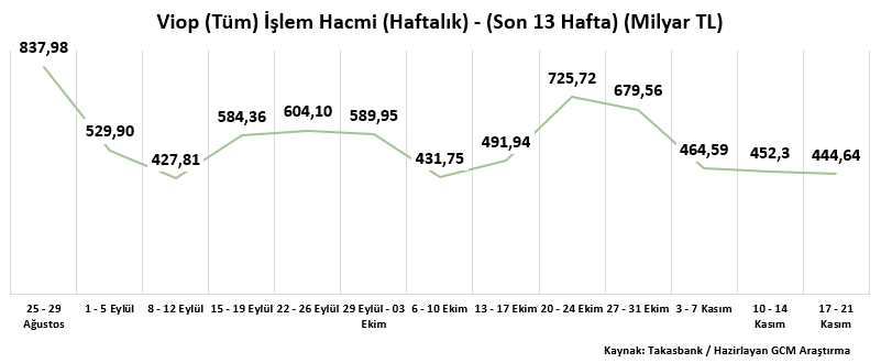 17 - 21 Kasım 2025 haftasına yönelik VİOP toplam işlem hacmi 444,64 milyar TL olarak kaydedilmiştir. Bu tutar bir önceki haftaki 452,30 milyar TL ile kıyaslandığında hacimsel açıdan sınırlı bir düşüşe işaret etmektedir. Son 13 haftanın en yüksek hacimsel performansı 25 – 29 Ağustos haftasındaki 837,98 milyar TL, en düşük hacimsel performans ise 8 – 12 Eylül haftasındaki 427,81 milyar TL olmayı sürdürmektedir.