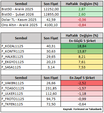 VİOP Haftalık değişimine (%) geçtiğimizde; Bist30 Aralık vade sözleşme fiyatı haftayı yüzde 2,87 yükselişle 12.252 seviyesinden kapattı. Viop tarafında işlem gören şirketlerin haftalık performansını (Kasım vade) değerlendirdiğimizde, pozitif tarafta dikkat çeken şirketler KOZAL ve KONTR olurken, negatif tarafta dikkat çekenlerse VAKBN ve TOASO olarak kaydedilmiştir.