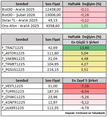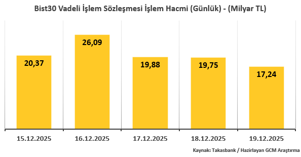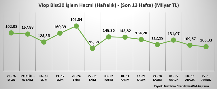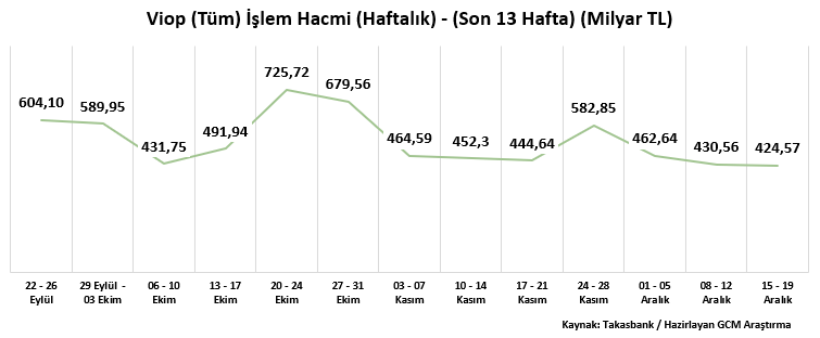 15 – 19 Aralık 2025 haftasına yönelik VİOP toplam işlem hacmi 424,57 milyar TL olarak kaydedilmiştir. Bu tutar bir önceki haftaki 430,56 milyar TL ile kıyaslandığında hacimsel açıdan sınırlı bir düşüşe işaret etmektedir. Son 13 haftanın en yüksek hacimsel performansı 20 – 24 Ekim haftasındaki 725,72 milyar TL olmayı sürdürürken, en düşük hacimsel performans ise 15 - 19 Aralık haftasındaki 424,57 milyar TL olarak kaydedilmiştir.