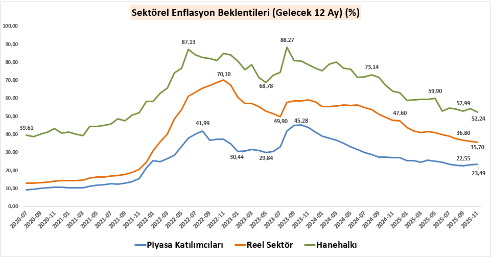 12 ay sonrasına yönelik yıllık enflasyon beklentisi piyasa katılımcılarında sınırlı bir artışla %23,49 seviyesine yükselirken, reel sektör beklentisi 0,60 puanlık düşüşle %35,70’e geriledi. Hanehalkı tarafında ise daha belirgin bir iyileşme izlendi ve beklenti 2,15 puan azalarak %52,24 seviyesine indi.