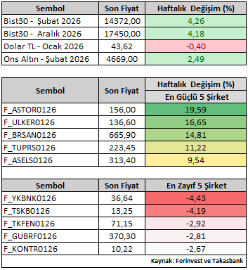 Fiyatlama tarafında, BIST30 Şubat vade sözleşmesi haftayı %4,26 yükselişle 14.372 seviyesinden tamamlamıştır. Ocak vade kontratlar bazında şirket performansları incelendiğinde, ASTOR ve ULKER pozitif ayrışırken, YKBNK ve TSKB haftanın görece zayıf performans sergileyen hisseleri olmuştur. Söz konusu ayrışmanın, şirket bazlı beklentiler ve sektörel dinamiklerden kaynaklandığı değerlendirilmektedir.