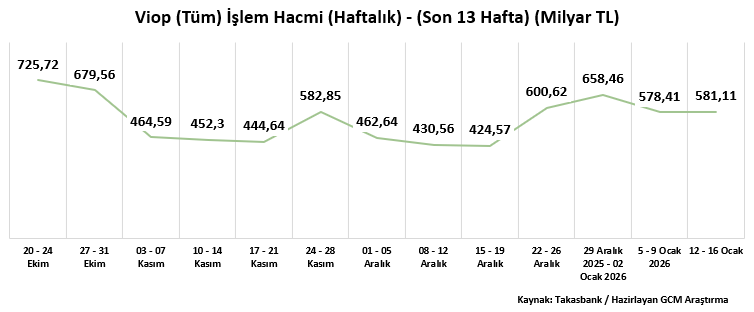 12–16 Ocak 2026 haftasında VİOP toplam işlem hacmi 581,11 milyar TL olarak gerçekleşmiş, bir önceki haftadaki 578,41 milyar TL seviyesine kıyasla hacimde yatay bir seyir izlenmiştir. Son 13 haftalık dönem değerlendirildiğinde, en yüksek işlem hacmi 20–24 Ekim haftasında 725,72 milyar TL, en düşük hacim ise 15–19 Aralık haftasında 424,57 milyar TL olarak kaydedilmiştir
