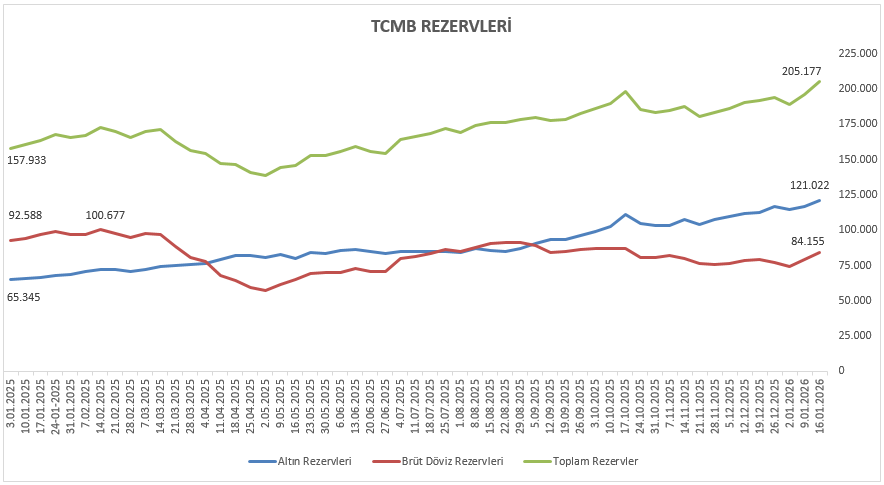 Rezervler cephesinde, 16 Ocak ile biten haftada TCMB brüt rezervleri 205,17 milyar dolar seviyesine yükselirken, döviz ve altın rezervlerinde de toplamda 9,10 milyar dolarlık artış kaydedildi. Net rezervler ise 82,93 milyar dolardan 91,01 milyar dolara toparlanma gösterdi gösterdi.