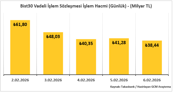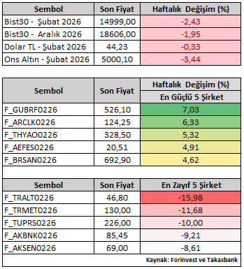 Fiyatlama tarafında, BIST30 Şubat vade sözleşmesi haftayı %2,43 düşüşle 14.999 seviyesinden tamamlamıştır. Şubat vade kontratlar bazında şirket performansları incelendiğinde, GUBRF ve ARCLK pozitif ayrışırken, TRALT ve TRMET haftanın görece zayıf performans sergileyen hisseleri olmuştur. Ayrışmanın, şirket bazlı beklentiler ve sektörel dinamiklerden kaynaklandığı değerlendirilmektedir.