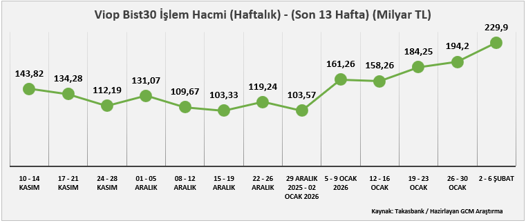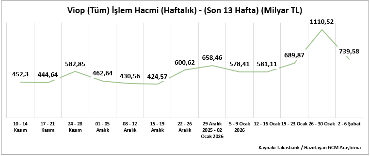 2 – 6 Şubat 2026 haftasında VİOP toplam işlem hacmi 739,58 milyar TL olarak gerçekleşmiş, bir önceki haftadaki 1.110,52 milyar TL seviyesine kıyasla hacimde belirgin bir düşüş kaydedilmiştir. Son 13 haftalık dönem değerlendirildiğinde, en yüksek işlem hacmi 26 – 30 Ocak haftasında 1110,52 milyar TL ile izlenirken, en düşük hacim 15–19 Aralık haftasında 424,57 milyar TL seviyesinde gerçekleşmiştir.