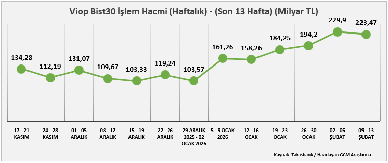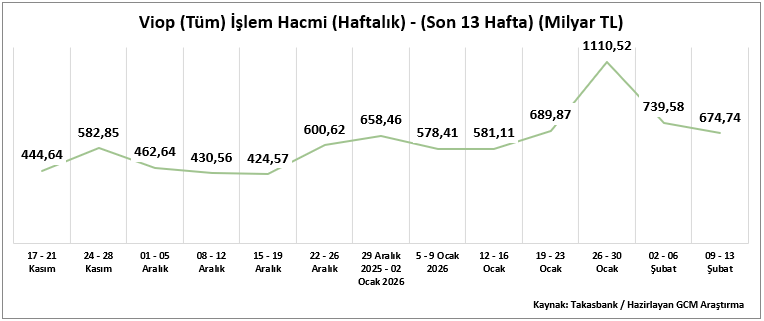 09 – 13 Şubat 2026 haftasında VİOP toplam işlem hacmi 674,74 milyar TL olarak gerçekleşmiş, önceki haftadaki 739,58 milyar TL seviyesine kıyasla sınırlı bir gerileme kaydedilmiştir. Son 13 haftalık dönem değerlendirildiğinde, en yüksek işlem hacmi 26 – 30 Ocak haftasında 1110,52 milyar TL ile izlenirken, en düşük hacim 15–19 Aralık haftasında 424,57 milyar TL seviyesinde gerçekleşmiştir.