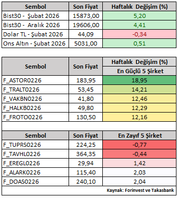 Fiyatlama tarafında, BIST30 Şubat vade sözleşmesi haftayı %5,20 yükselişle 15.873 seviyesinden tamamlamıştır. Şubat vade kontratlar bazında şirket performansları incelendiğinde, ASTOR ve TRALT pozitif ayrışırken, TUPRS ve TAVHL haftanın görece zayıf performans sergileyen hisseleri olmuştur. Ayrışmanın, şirket bazlı beklentiler ve sektörel dinamiklerden kaynaklandığı değerlendirilmektedir.