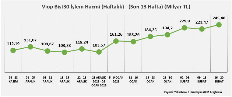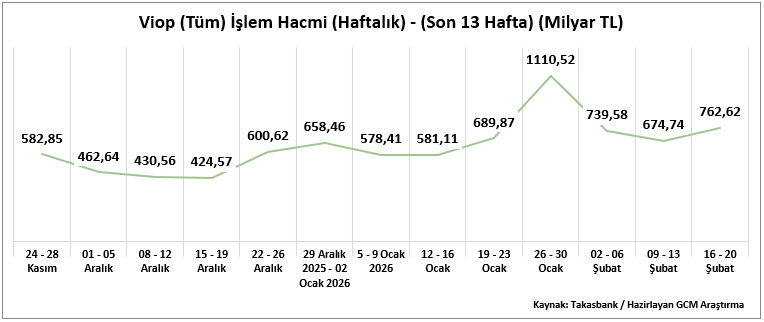 16 – 20 Şubat 2026 haftasında VİOP toplam işlem hacmi 762,62 milyar TL olarak gerçekleşmiş, önceki haftadaki 674,74 milyar TL seviyesine kıyasla belirgin bir artış kaydedilmiştir. Son 13 haftalık dönem değerlendirildiğinde, en yüksek işlem hacmi 26 – 30 Ocak haftasında 1110,52 milyar TL ile izlenirken, en düşük hacim 15–19 Aralık haftasında 424,57 milyar TL seviyesinde gerçekleşmiştir.