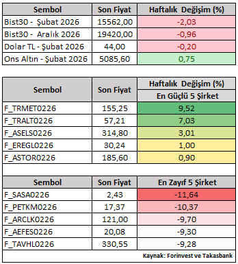 Fiyatlama tarafında, BIST30 Şubat vade sözleşmesi haftayı %2,03 düşüşle 15.562 seviyesinden tamamlamıştır. Hacim artışına rağmen haftalık kapanışın negatif gerçekleşmesi, kısa vadede jeopoltiik risk temasına bağlı kar realizasyonlarının öne çıktığını göstermektedir. Şubat vade kontratlar bazında şirket performansları incelendiğinde, TRMET ve TRALT pozitif ayrışırken, SASA ve PETKM haftanın en zayıf performans sergileyen hisseleri olmuştur. Ayrışmanın sektör bazlı dinamiklerden kaynaklandığı görülmektedir.