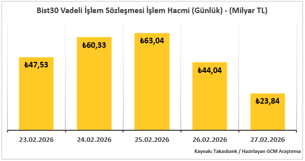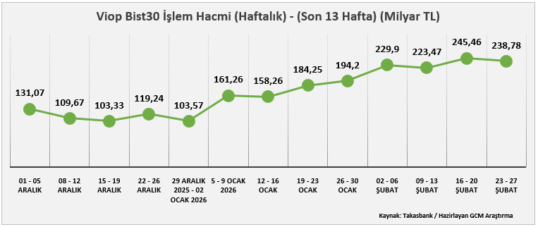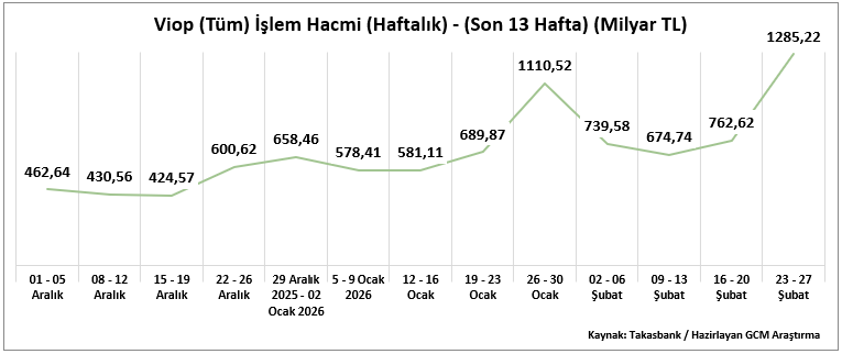 23 – 27 Şubat 2026 haftasında VİOP toplam işlem hacmi 1.285,22 milyar TL olarak gerçekleşmiş ve önceki haftadaki 762,62 milyar TL seviyesine kıyasla güçlü artış kaydedilmiştir. Son 13 haftalık dönem içinde en yüksek işlem hacim bu haftaki 1.285,22 milyar TL ile olarak revize edilirken, en düşük hacim 15–19 Aralık 2025 haftasında 424,57 milyar TL seviyesinde kalmaya devam etmektedir.