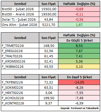 Fiyatlama tarafında, BIST30 Şubat vade sözleşmesi haftayı %0,69 düşüşle 15.502 seviyesinden tamamlamıştır. Hacim artışına rağmen haftalık kapanışın negatif gerçekleşmesi, kısa vadede jeopoltiik risk temasına bağlı kar realizasyonlarının öne çıktığını göstermektedir. Şubat vade kontratlar bazında şirket performansları incelendiğinde, TRMET ve EREGL pozitif ayrışırken, TKFEN ve SOKM haftanın en zayıf performans sergileyen hisseler olmuştur. Ayrışmanın sektör bazlı dinamiklerden kaynaklandığı görülmektedir.