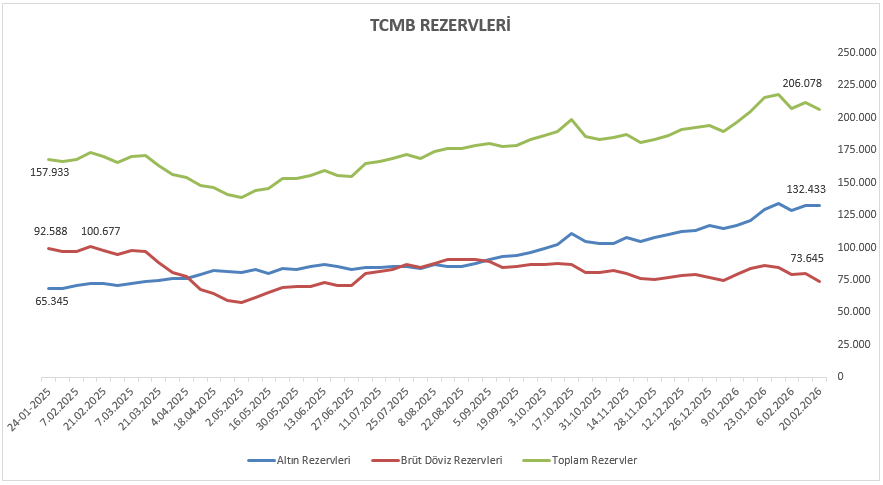Rezervler cephesinde, 20 Şubat ile biten haftada TCMB brüt rezervleri 206,07 milyar dolar seviyesine gerilerken, döviz ve altın rezervlerinde de toplamda 5,70 milyar dolarlık azalış kaydedildi. Net rezervler ise 95,87 milyar dolardan 89,18 milyar dolara azalış kaydetti.