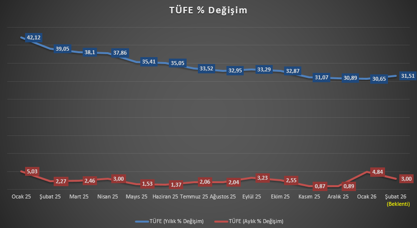 Şubat ayı TÜFE verisi, yılın ilk çeyreğinde fiyatlama davranışlarının seyri ve dezenflasyon sürecinin ivmesi açısından kritik önem taşımaktadır. Ocak ayında kaydedilen yüksek artışların ardından gözler, aylık fiyatlama momentumunun devam edip etmeyeceğine ve yıllık enflasyonun ana eğiliminde bir kırılma oluşup oluşmayacağına çevrilmiş durumdadır.