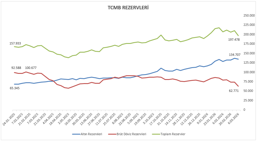 Rezervler cephesinde, 6 Mart ile biten haftada TCMB brüt rezervleri 197,47 milyar dolar seviyesine gerilerken, döviz ve altın rezervlerinde de toplamda 12,78 milyar dolarlık azalış kaydedildi. Net rezervler ise 91,78 milyar dolardan 78,78 milyar dolara azalış kaydetti.