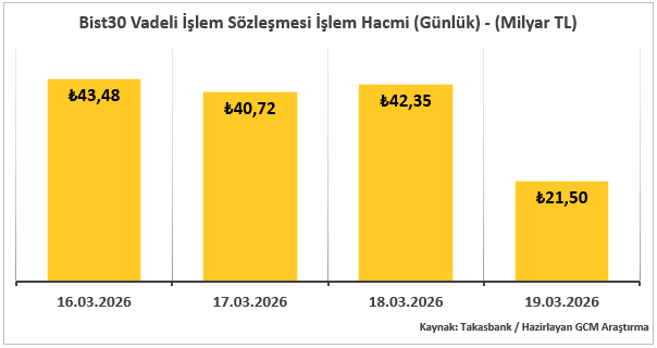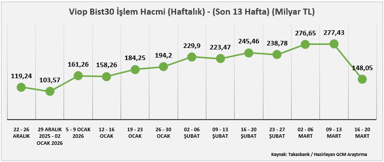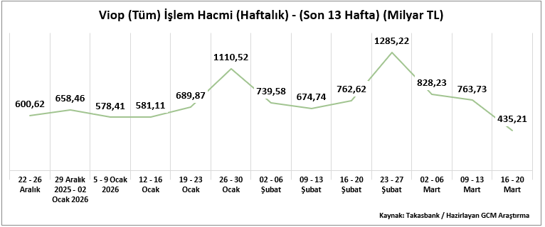 16 – 20 Mart 2026 haftasında VİOP toplam işlem hacmi 435,21 milyar TL olarak gerçekleşmiş ve önceki haftadaki 763,73 milyar TL seviyesine kıyasla belirgin azalış kaydedilmiştir. Son 13 haftalık dönem içinde en yüksek işlem hacim 23–27 Şubat 2026 haftasında 1.285,22 milyar TL, en düşük hacimse 16 – 20 Mart 2026 haftasında 435,21 milyar TL olarak kaydedilmiştir.