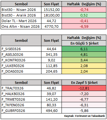 Fiyatlama tarafında, BIST30 Şubat vade sözleşmesi haftayı %0,74 düşüşle 15.152 seviyesinden tamamlamıştır. Kısa vadede jeopolitik risk temasının ve bu hafta özelindeki bayram tatilinin endeks ve pay vadeli performanslar üzerinde etkisi dikkat çekmektedir. Mart vade kontratlar bazında şirket performansları incelendiğinde, SISE ve ASELS pozitif ayrışırken, TRALT ve HALKB haftanın en zayıf performans sergileyen hisseler olmuştur.