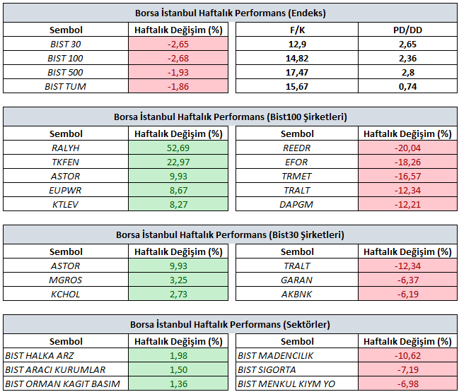 Haftalık bazda en iyi şirket performansı yüzde 52,69 yükselişle RALYH, yüzde 22,97 yükselişle TEKFN ve yüzde 9,93 yükselişle ASTOR tarafında gerçekleşirken en kötü performanslarsa yüzde 20,04 düşüşle REEDR yüzde 18,26 düşüşle EFOR ve yüzde 16,57 düşüşle TRMET tarafında gerçekleşti.