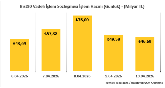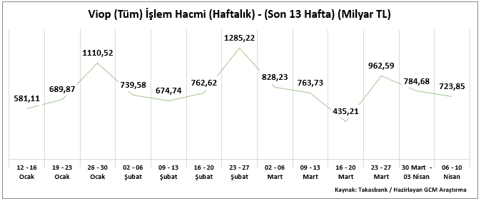 6 – 10 Nisan 2026 haftasında VİOP toplam işlem hacmi 723,85 milyar TL olarak gerçekleşmiş ve önceki haftadaki 784,68 milyar TL seviyesine kıyasla sınırlı bir azalış kaydetmiştir. Son 13 haftalık dönem içinde en yüksek işlem hacim 23–27 Şubat 2026 haftasında 1.285,22 milyar TL, en düşük hacimse 16 – 20 Mart 2026 haftasında 435,21 milyar TL olarak gerçekleşmiştir.