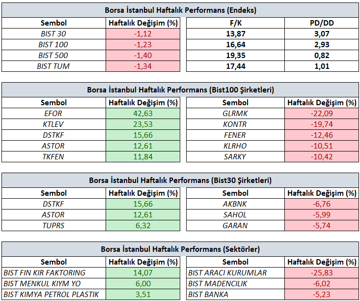 Haftalık bazda en iyi şirket performansı yüzde 42,63 yükselişle EFOR, yüzde 23,53 yükselişle KTLEV ve yüzde 15,66 yükselişle DSTKF tarafında gerçekleşirken en kötü performanslarsa yüzde 22,09 düşüşle GLRMK yüzde 19,74 düşüşle KONTR ve yüzde 12,46 düşüşle FENER tarafında gerçekleşti.