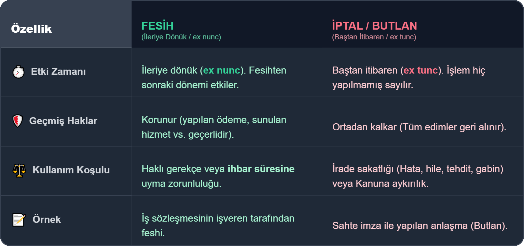 Fesih, geçerli bir sözleşmeyi geleceğe yönelik sona erdirirken; iptal, kuruluşundaki sakatlık nedeniyle sözleşmeyi baştan geçersiz kılar.