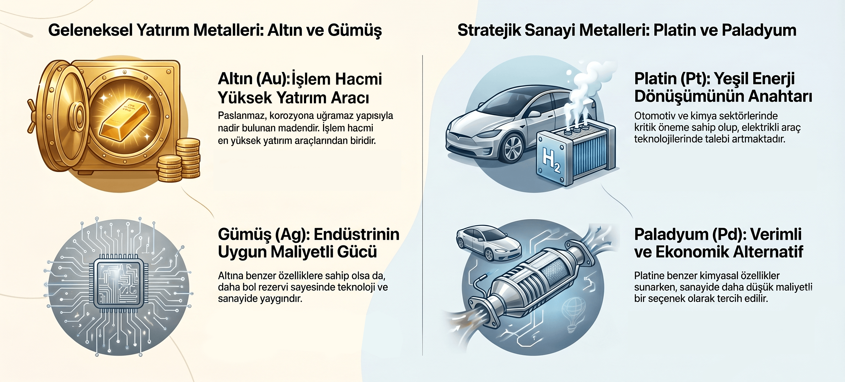 Kıymetli madenler; endüstriyel kullanım, tarihsel para birimi olma özelliği veya altın gibi güvenli liman yatırımı olma vasıflarıyla öne çıkarlar. Günümüzün dijital finans dünyasında yatırımcıların karşısına ürün olarak çıkarlar. Bu nedenle, kıymetli madenlerin yalnızca fiziksel özellikleri değil, yatırım aracı olarak sundukları özellikler de merak edilmektedir. O halde; altın nedir, paladyum nedir, platin nedir? ve yatırım dünyasındaki enstrüman karşılıkları nelerdir? yakından bakalım.