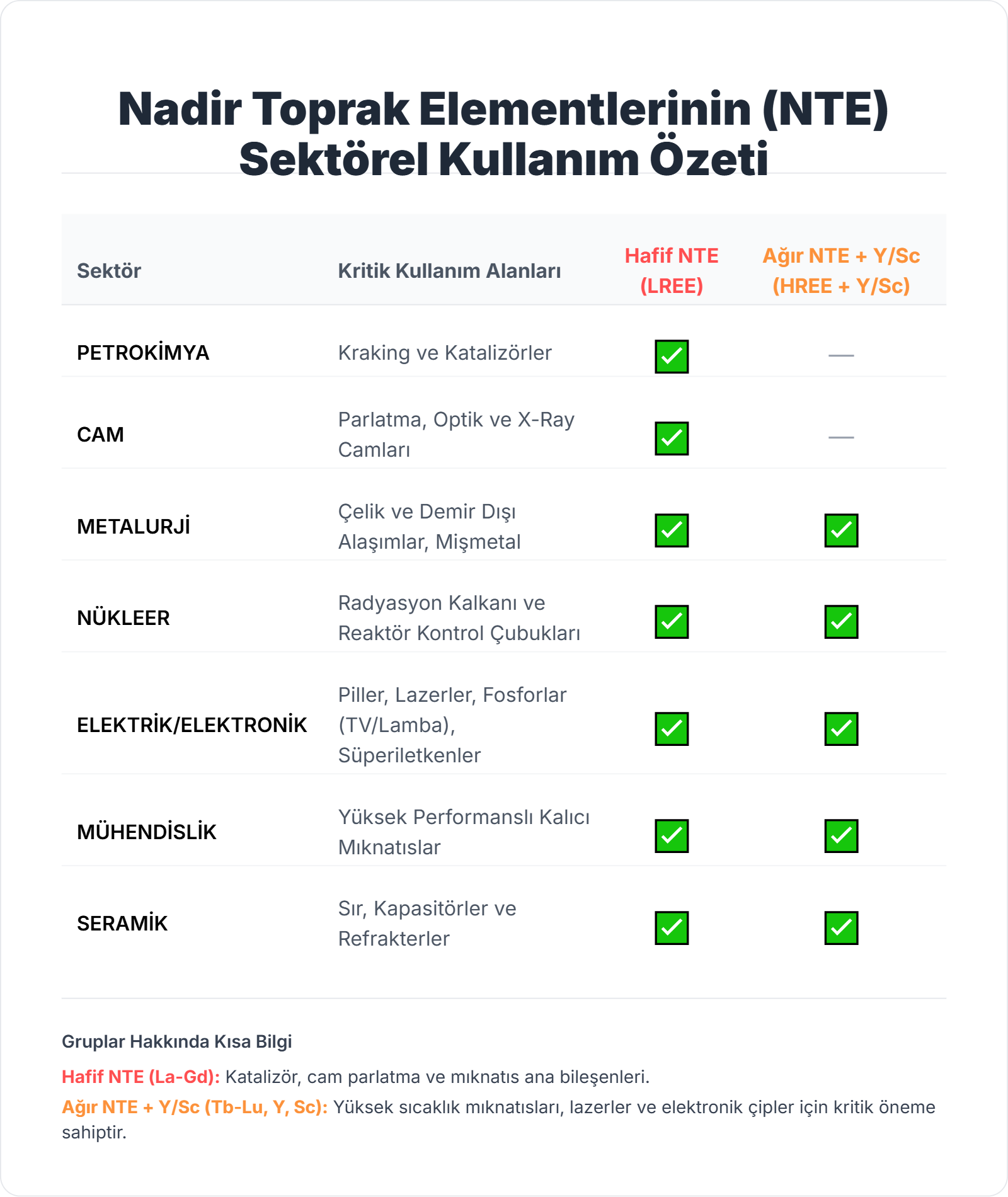 NTE'ler, mıknatıslar, katalizörler, elektronik cihazlar, lazerler, cam-seramikler, şarj edilebilir piller, medikal görüntüleme, savunma sistemleri, rüzgar türbinleri ve elektrikli araç bataryaları gibi alanlarda yaygın olarak kullanılır. Bu elementler, yüksek sıcaklığa dayanıklı alaşımlar ve optik malzemelerin üretiminde de kritik öneme sahiptir.