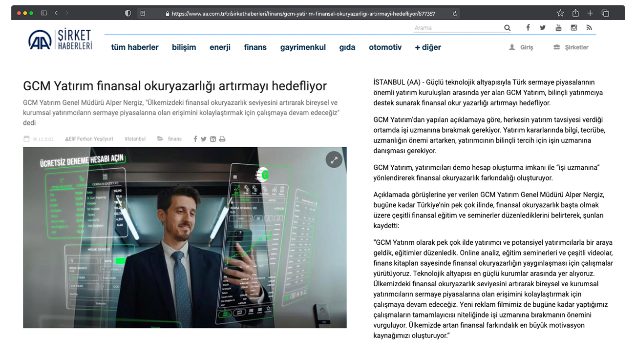 Finans piyasasının doğru tanınması ve Türkiye’de finansal bilincin artması için düzenli olarak eğitimler veren GCM Yatırım Menkul Değerler, aynı zamanda sektörün de gelişimi ve daha ileriye gitmesi için gayret göstermektedir. GCM Yatırım Menkul Değerler, sektörde ürün çeşitliliğin zenginleşmesi amacıyla inovatif ürünler geliştirmekte ve yatırımcının faydasına sunmaktan büyük mutluluk duymaktadır. GCM Yatırım Menkul Değerler’le ilgili gelişmeleri aşağıda ki linklerden takip edebilirsiniz.