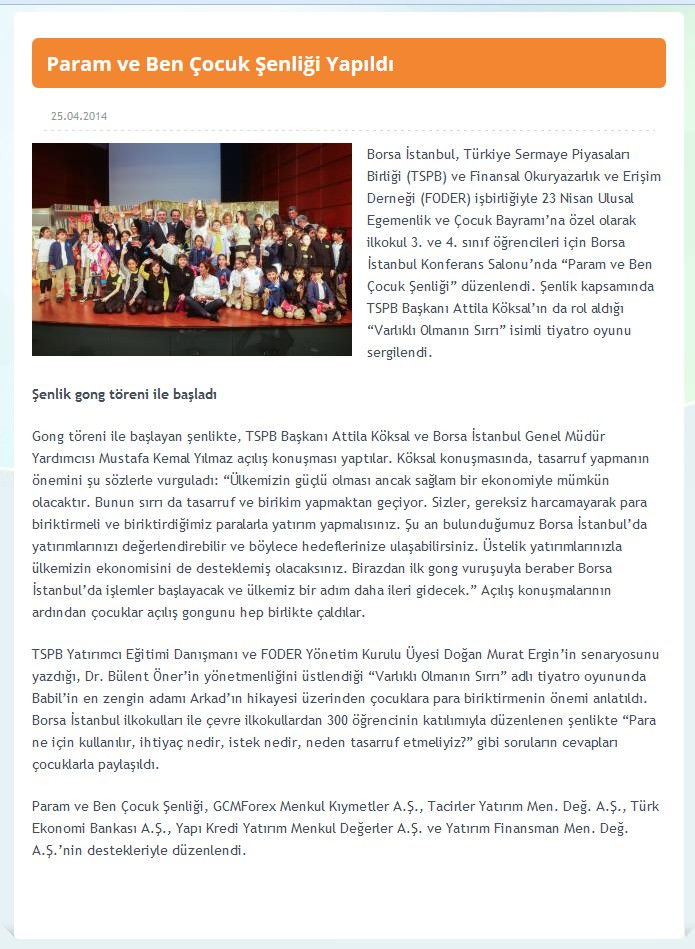 TSPB, Borsa İstanbul ve FODER işbirliğiyle 25 Nisan 2014 tarihinde Borsa İstanbul ilkokulları ile çevre ilkokullardaki 3. ve 4. sınıf öğrencilerine yönelik olarak, “Param ve Ben Çocuk Şenliği” yapıldı. Borsa İstanbul’da yapılan organizasyonda “Para ne için kullanılır, ihtiyaç nedir, istek nedir, hedeflerimiz için neden tasarruf etmeliyiz?” gibi konularda mesajlar verilmesi hedeflendi. GCM Yatırım Menkul Değerler A.Ş. söz konusu projeyi destekleyen kurumlar arasında yer aldı.
