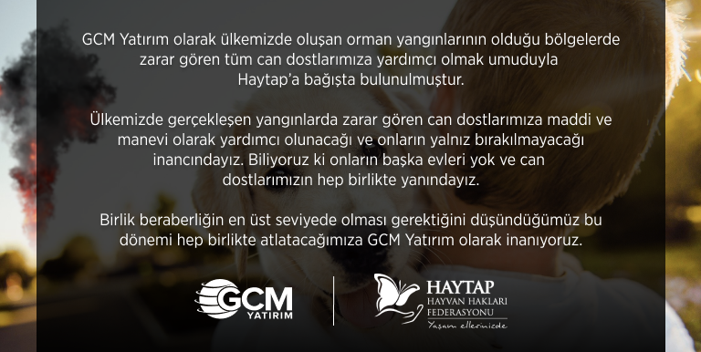 GCM Yatırım olarak ülkemizde çıkan orman yangınları sebebiyle zarar gören bölgelerimizin yeniden yeşertilmesi ve ağaçlandırılması için Tema Vakfı'na fidan bağışında bulunulmuştur. Ayrıca afet bölgelerinde etkilenen vatandaşlarımızın acil ihtiyaçlarının karşılanması ve yardımlara destek olmak amacıyla Kızılay’a bağışta bulunulmuştur. Ülkemizde gerçekleşen yangınlardan dolayı hayatını kaybeden vatandaşlarımıza Allah'tan rahmet, yangından etkilenen tüm canlılara acil şifalar dileriz. Bu yangınların bir an önce kontrol altına alınmasını temenni eder, yaşanan tahribattan dolayı derin bir üzüntü içinde olduğumuzu belirtiriz. Birlik beraberliğin en üst seviyede olması gerektiğini düşündüğümüz bu dönemi hep birlikte atlatacağımıza GCM Yatırım olarak inanıyoruz.