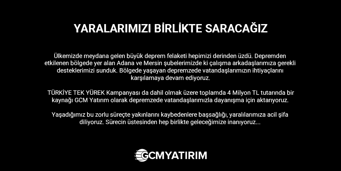 Ülkemizde meydana gelen büyük deprem felaketi hepimizi derinden üzdü. Depremden etkilenen bölgede yer alan Adana ve Mersin şubelerimizde ki çalışma arkadaşlarımıza gerekli desteklerimizi sunduk. Bölgede yaşayan depremzede vatandaşlarımızın ihtiyaçlarını karşılamaya devam ediyoruz. TÜRKİYE TEK YÜREK Kampanyası da dahil olmak üzere toplamda 4 Milyon TL tutarında bir kaynağı GCM Yatırım olarak depremzede vatandaşlarımızla dayanışma için aktarıyoruz.