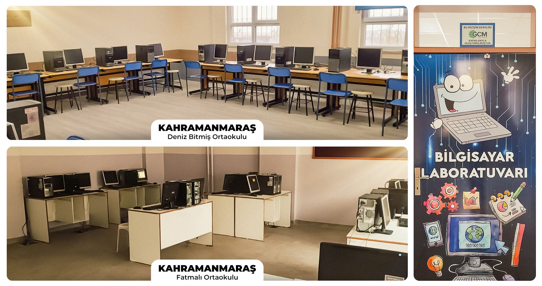 GCM Yatırım, asrın felaketi olarak dünya tarihine de geçen, 6 Şubat 2023 tarihinde Kahramanmaraş merkezli olan ve 11 ilin ağır hasar aldığı depremden etkilenen çocuk genç ve ailelerin temel ihtiyaçlarına destek olmaya devam ediyor. Depremin ilk gününden beri bölgeye yardımlarını sürdüren Kurumumuz eğitimin çocukların en büyük temel ihtiyaçlarından olduğu hassasiyeti ile Kahramanmaraş’ta 2 okulda bilişim teknoloji derslikleri oluşturdu. Günümüz dijital dünyasında bilgisayar ve teknolojilerini kullanmanın ve anlamanın çocukların geleceğinde yaratacağı değere katkı sağlamak amacıyla GCM Yatırım Kahramanmaraş Deniz Bitmiş Ortaokulu Bilişim Teknoloji Dersliğini ve Kahramanmaraş Fatmalı Ortaokulu Bilişim Teknoloji Dersliğini kurdu.
