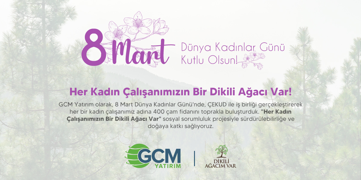 GCM Yatırım olarak, 8 Mart Dünya Kadınlar Günü'nde, her bir kadın çalışanımız için doğaya ve geleceğimize değerli bir katkı sunmak istedik. Sürdürülebilir dünya vizyonumuzu gerçeğe dönüştürmek amacıyla Çevre Kuruluşları Dayanışma Derneği (ÇEKUD) ile anlamlı bir iş birliği gerçekleştirdik. Sosyal sorumluluk projemiz kapsamında artık "Her Kadın Çalışanımızın Bir Dikili Ağacı Var."